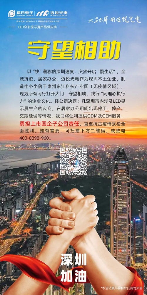 因為疫情,以“快”著稱的深圳速度,也突然開啟“慢”生活。3月15日,邁銳光電發(fā)布信息,表示該公司制造中心坐落在無疫情區(qū)域的惠州東江科技產(chǎn)業(yè)園,如深州市內(nèi)涉及LED顯示屏生產(chǎn)的友商,在居家辦公期間出現(xiàn)停工、停產(chǎn)、交期延誤等情況,該公司將讓利提供ODM及OEM服務,直至抗擊疫情戰(zhàn)役全面勝利,充分展現(xiàn)其“同理心執(zhí)行力”的企業(yè)文化和“守望相助”的使命責任。