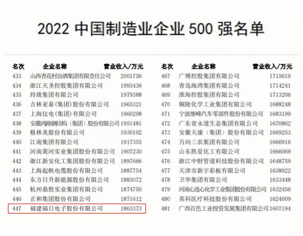 9月6日,中國(guó)企業(yè)聯(lián)合會(huì)、中國(guó)企業(yè)家協(xié)會(huì)舉行新聞發(fā)布會(huì)上,向社會(huì)發(fā)布了“2022中國(guó)企業(yè)500強(qiáng)”“2022中國(guó)制造業(yè)企業(yè)500強(qiáng)”“2022中國(guó)服務(wù)業(yè)企業(yè)500強(qiáng)”等各項(xiàng)榜單及其分析報(bào)告。其中,公司首次入圍中國(guó)制造業(yè)企業(yè)500強(qiáng),位列第447位。